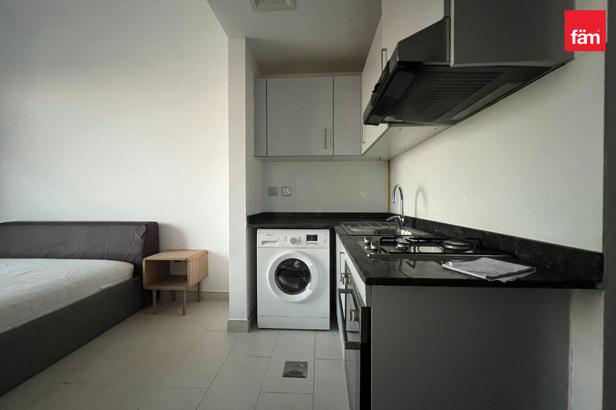The studio features 1 bathroom, built-in wardrobes, kitchen appliances, a balcony, elevator access, fitted air conditioning, and an open kitchen. Residents can also enjoy access to a fitness center, shared gym, and shared pool within the building.