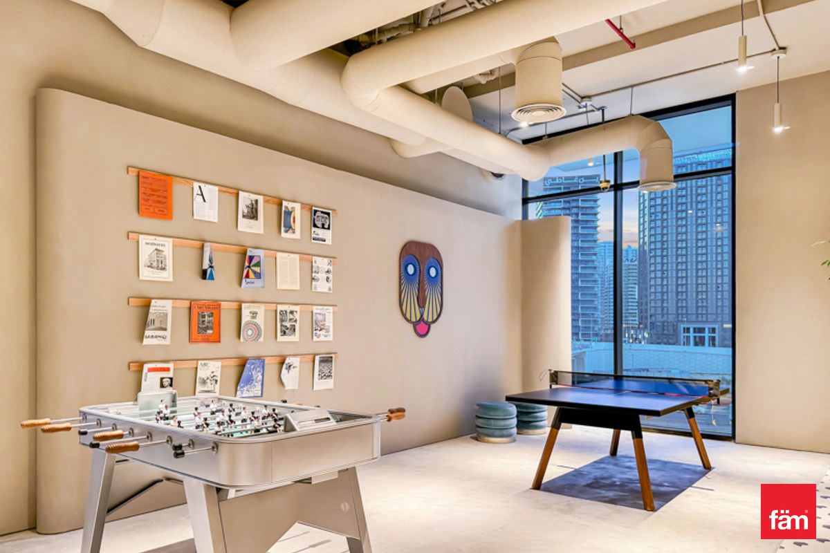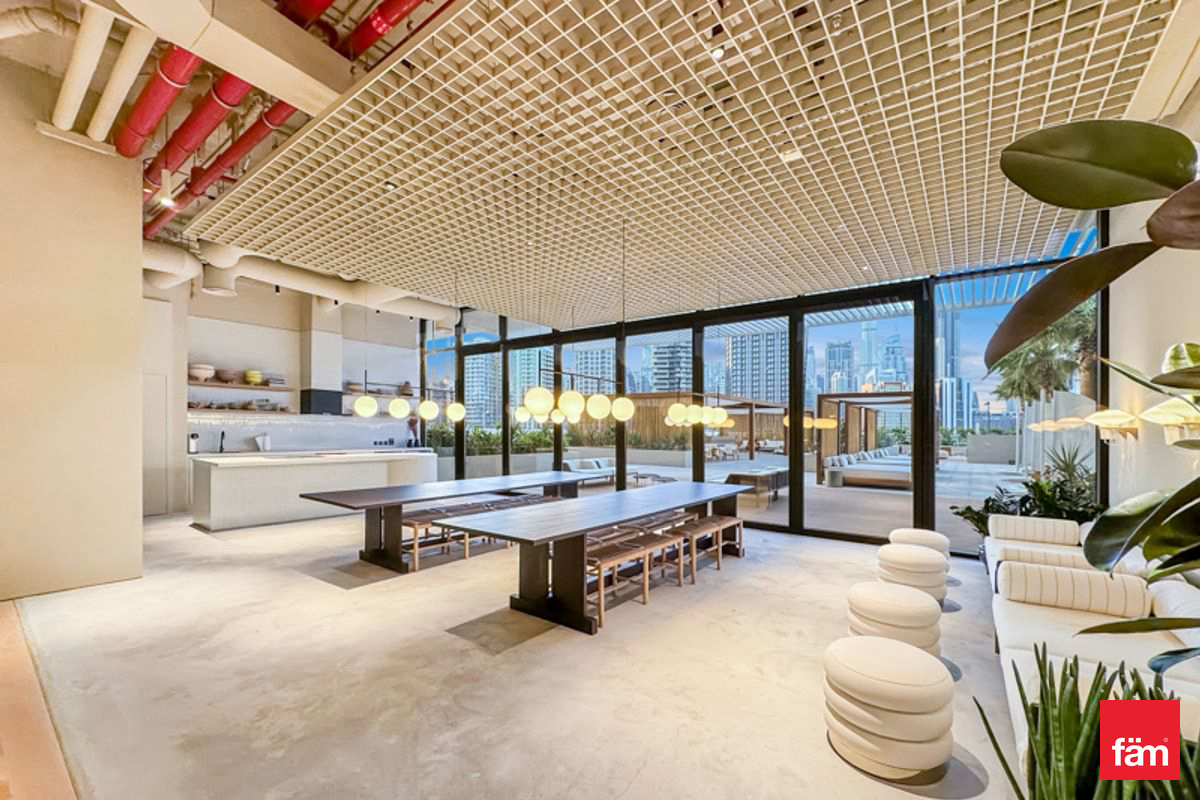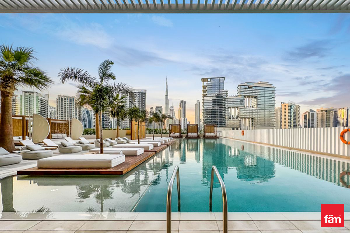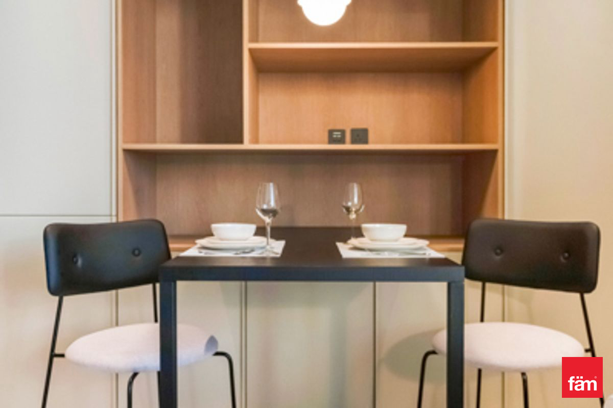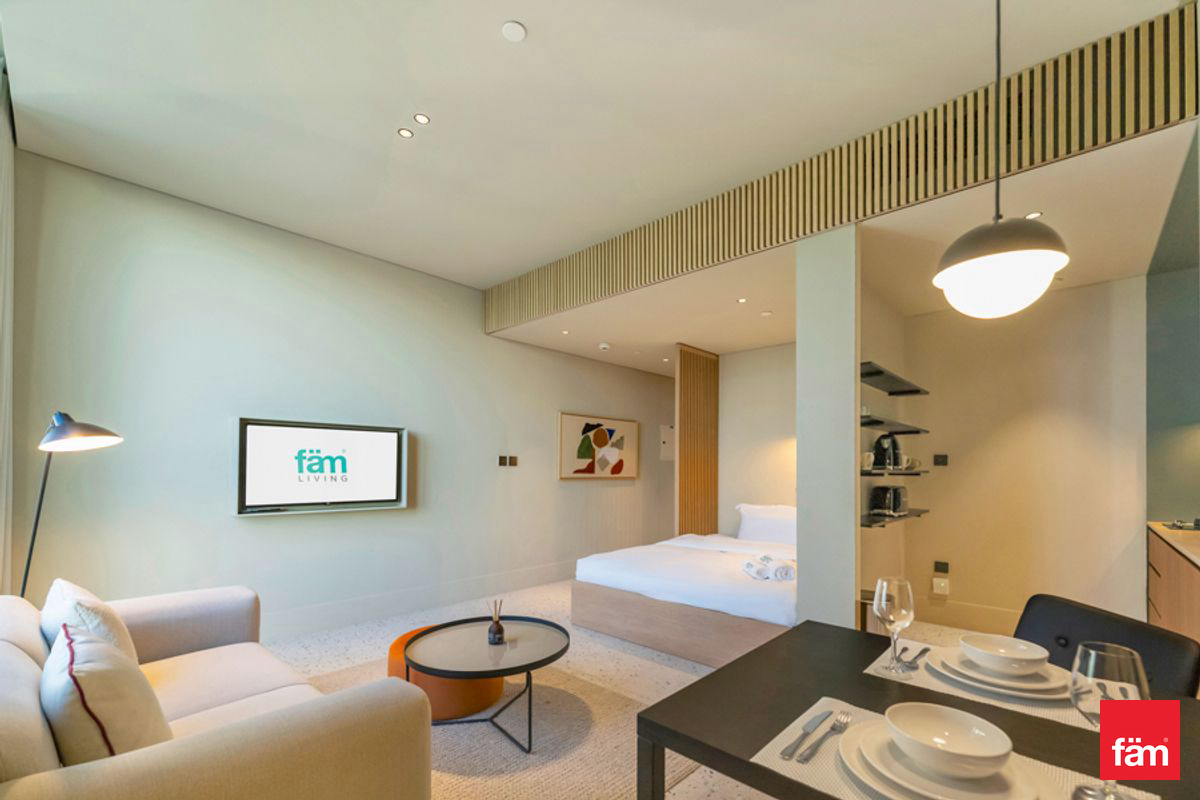 The apartment features an open-plan living and sleeping area, a fully equipped kitchenette, and floor-to-ceiling windows that fill the space with natural light. Residents can enjoy a hassle-free lifestyle in one of Dubai’s most dynamic districts.