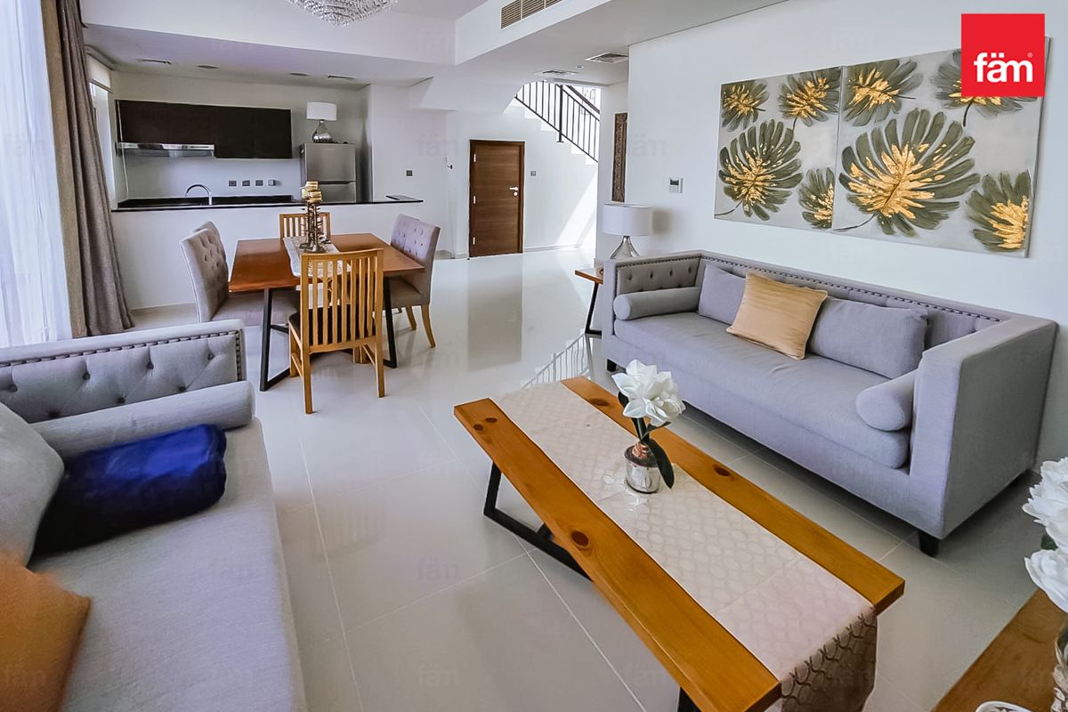 fäm Properties is pleased to present this beautifully maintained, Vastu-aligned, fully furnished 4-bedroom townhouse in the sought-after Pacifica cluster of DAMAC Hills 2. Offering comfort, space, and style, this home is ideal for families seeking a peaceful community lifestyle with modern conveniences.