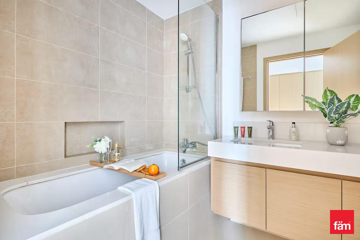 Both bedrooms are generously sized and fitted with built-in wardrobes. The master bedroom benefits from an en-suite bathroom, while the second bedroom is conveniently positioned next to the guest bathroom. High-quality furnishings, soft finishes, and thoughtful details ensure comfort and functionality throughout the apartment.