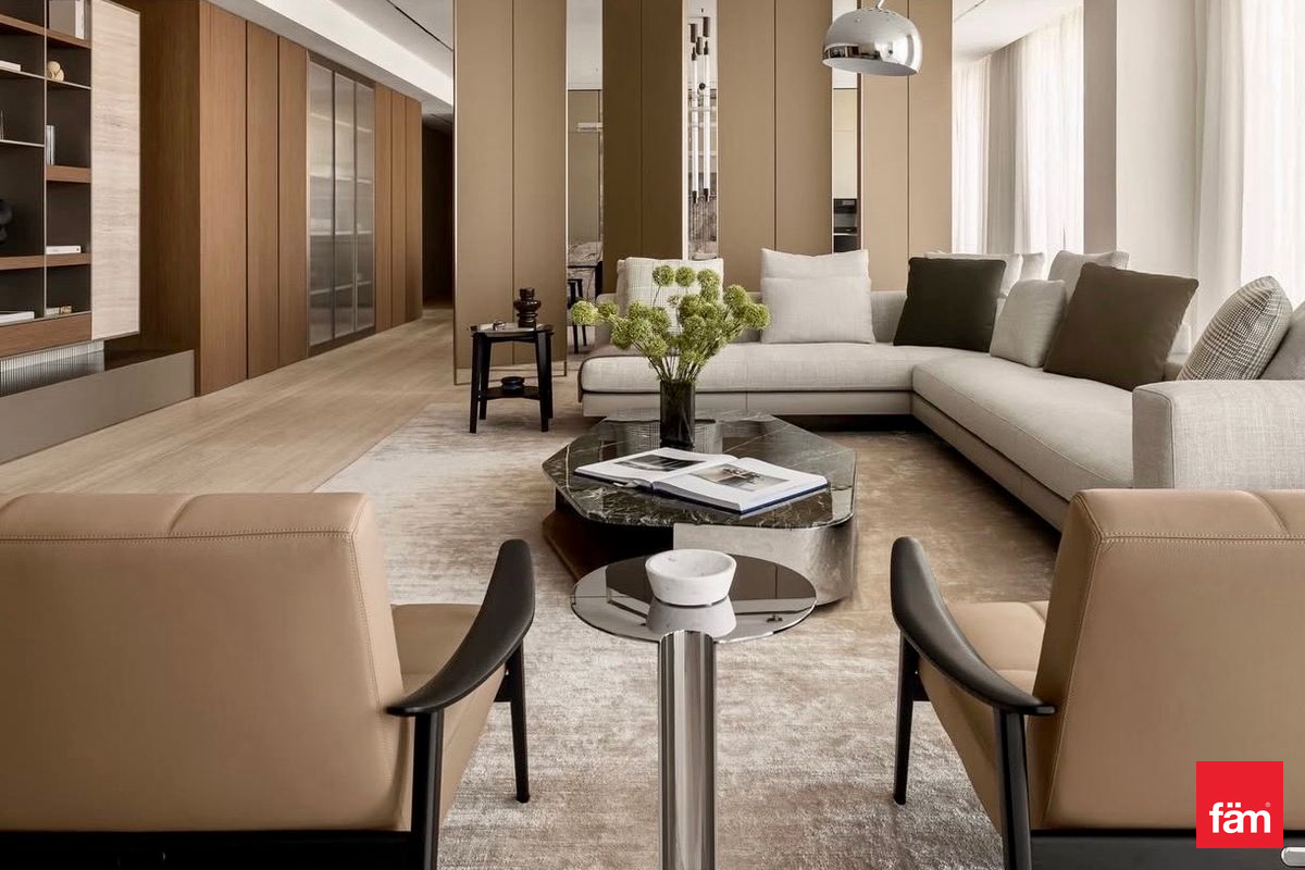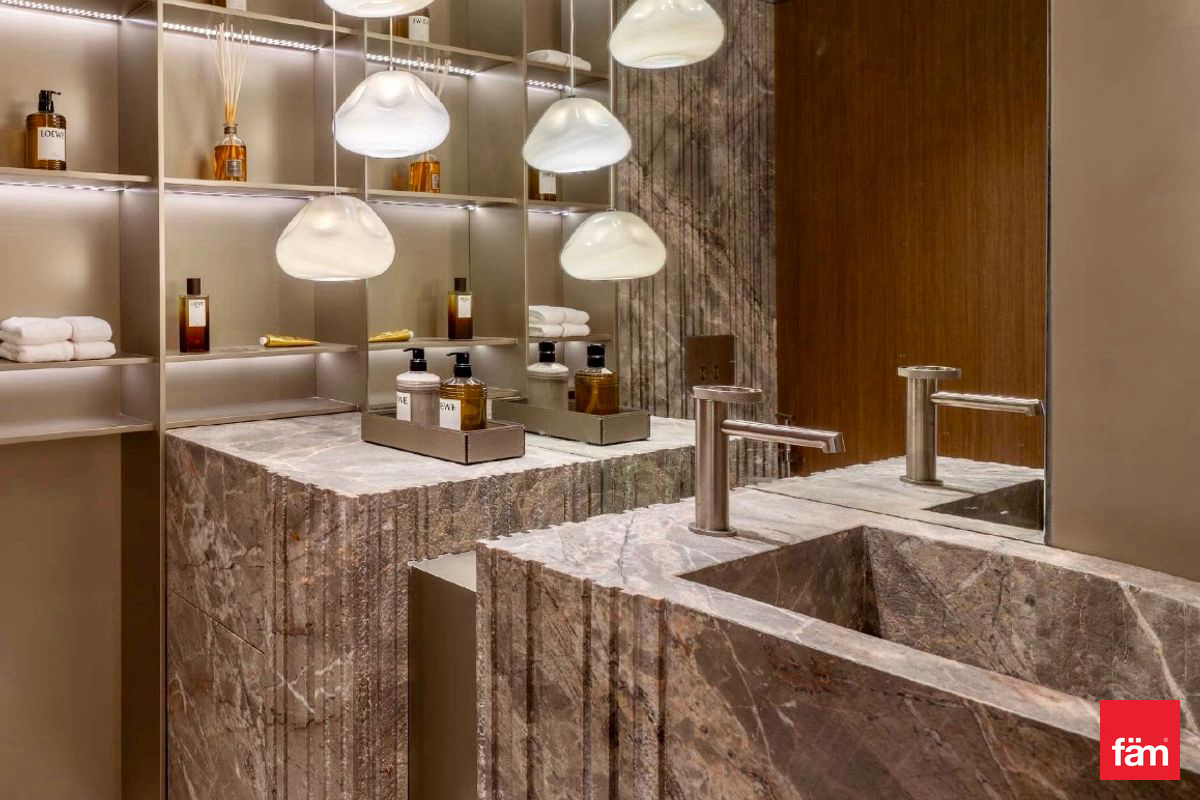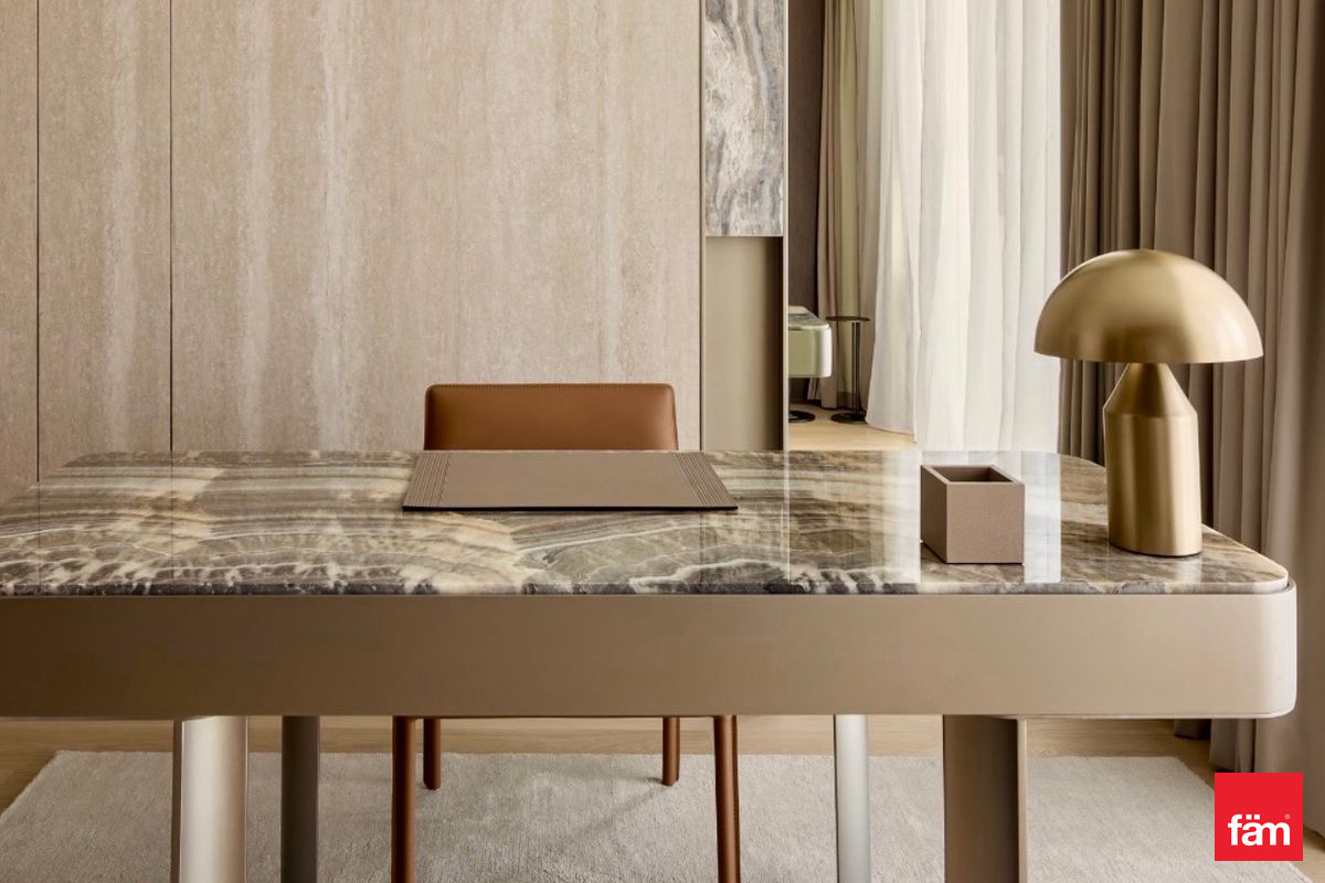 Fully curated interiors with Travertine Romano Classico, Fior Di Bosco Marble, Brushed Metals, and Almond-Stained Mahogany Veneers.