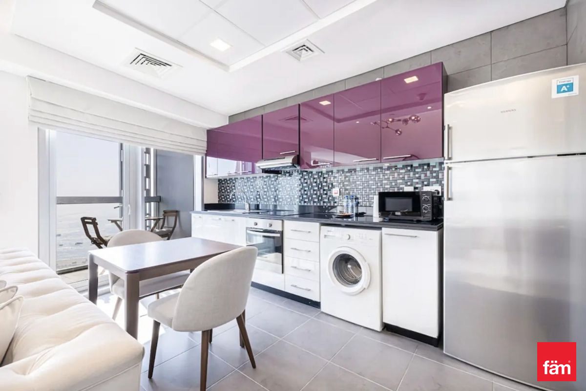 This spacious apartment boasts a modern open kitchen equipped with built-in wardrobes and essential kitchen appliances. Residents will enjoy the expansive balcony overlooking breathtaking ocean and sea views, providing a serene and luxurious living experience.