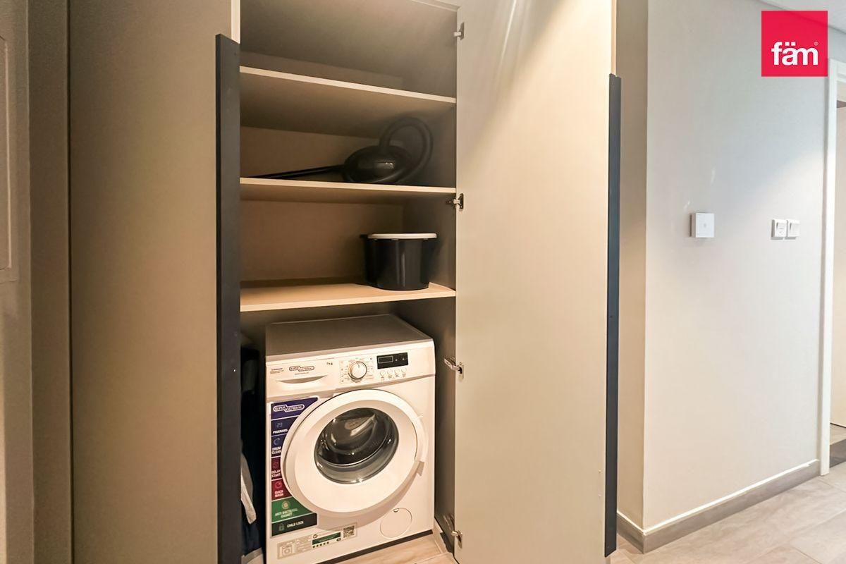 The apartment features 2 baths and offers a lovely community view. It comes equipped with built-in wardrobes, kitchen appliances, a storage room, laundry room, balcony, private gym, walk-in closet, and many more amenities. Situated on a high floor, residents can enjoy breathtaking landmark views.