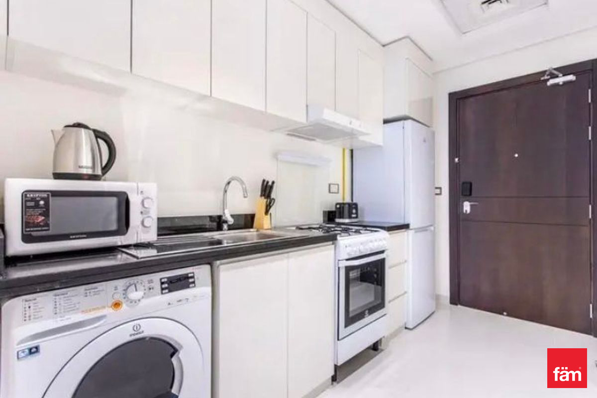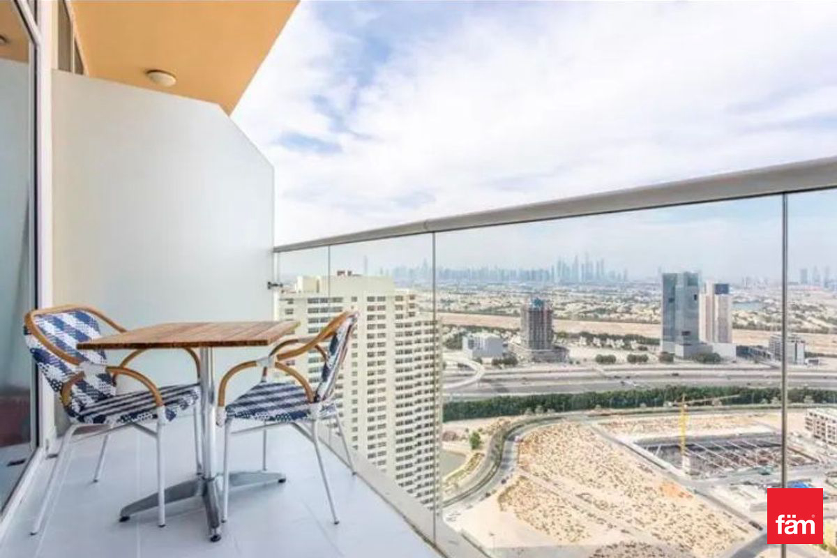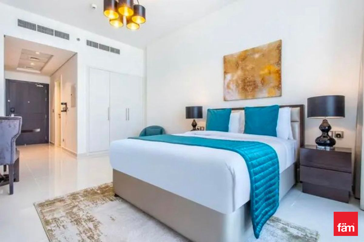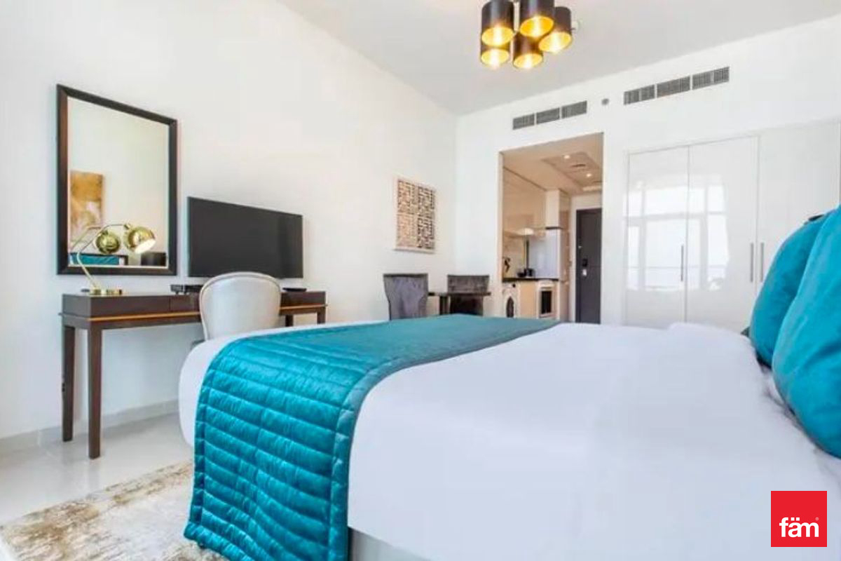 fäm Properties is pleased to present this elegantly furnished studio apartment located in the prestigious Ghalia community within Jumeirah Village Circle (JVC), Dubai. This brand-new, vastu-compliant residence offers a sophisticated living environment with a high floor position, providing serene park and landmark views.