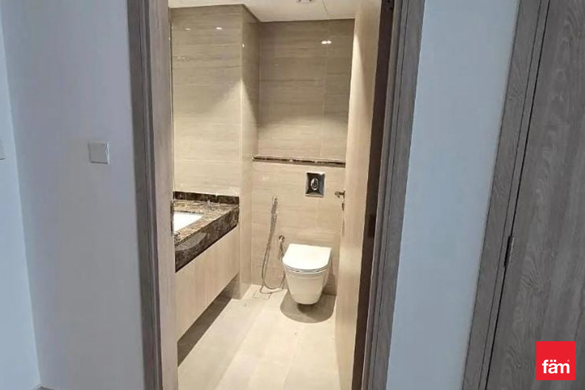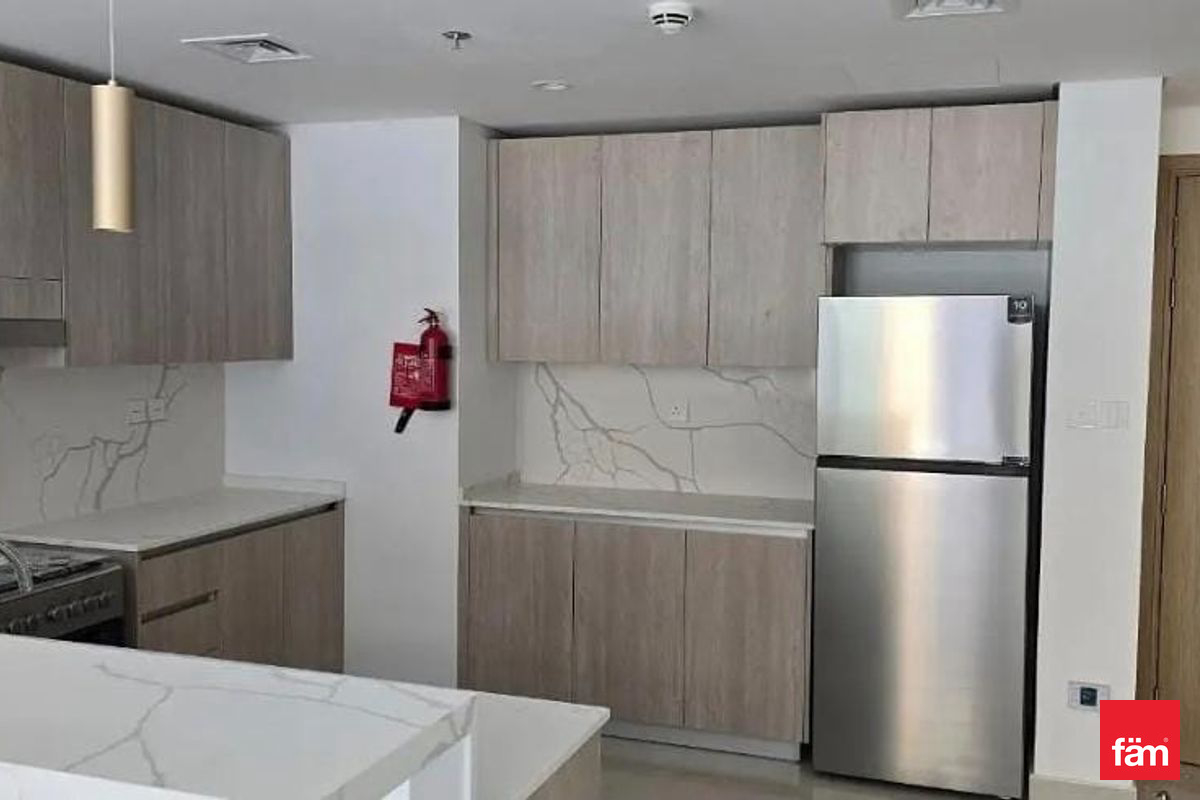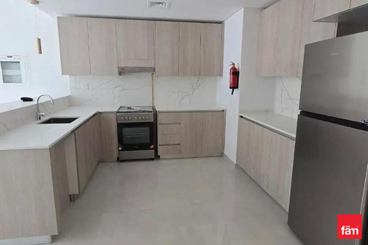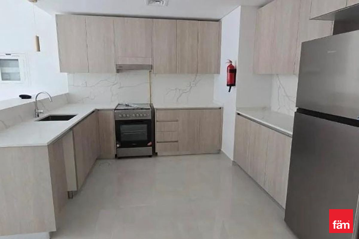This brand-new apartment offers a contemporary open kitchen equipped with essential kitchen appliances and built-in wardrobes, ensuring ample storage space. The living area opens to a balcony, providing serene community views and natural light throughout the space. The apartment is fully air-conditioned with central AC and features high-quality finishes throughout.