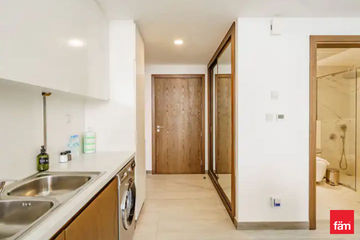 Step inside to discover an open kitchen equipped with modern appliances, ready to inspire your culinary creativity. The studio features built-in wardrobes and a walk-in closet, providing ample storage to keep your space neat and organized. Enjoy your morning coffee or unwind in the evening on your private balcony, overlooking the serene community views.