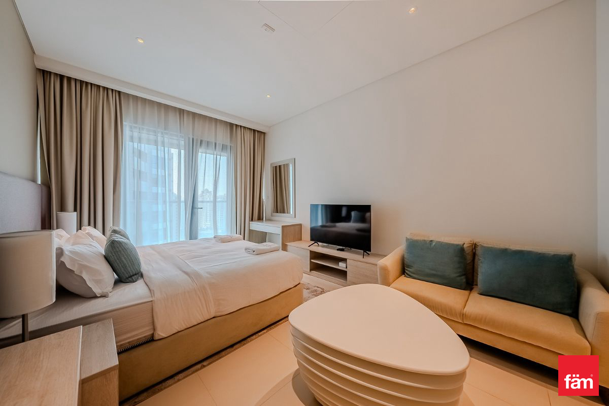 Spanning approximately 353 sq ft, the studio features a modern open-plan layout, a fully fitted kitchen, and floor-to-ceiling windows that open onto a private balcony. Enjoy community views with glimpses of Palm Jumeirah and the Royal Atlantis, all complemented by contemporary finishes and tasteful furnishings throughout.